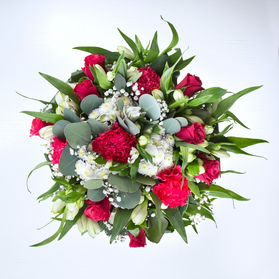Delight in the radiant beauty of our exclusive bouquet. This arrangement features opulent red roses, pure white chrysanthemums, and delicate gypsophila, gracefully complemented by white alstroemeria and vibrant aspidistra leaves.