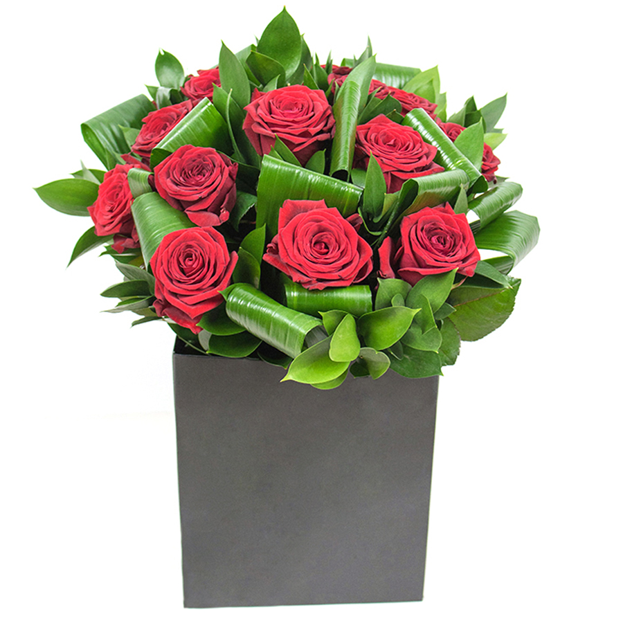 Our exquisite bouquet showcases red roses beautifully arranged with aspidistra leaves and ruscus, offering a perfect blend of color and texture.