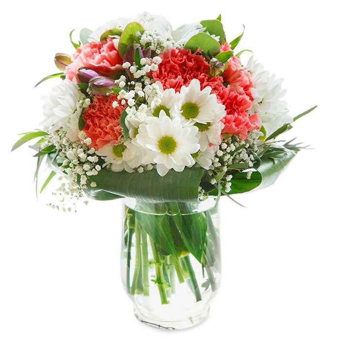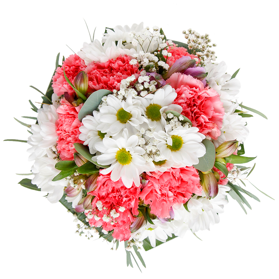 Enchant someone special with our beautiful bouquet, featuring snow-white chrysanthemums, delicate gypsophila, soft light pink carnations, and lush aspidistra leaves.